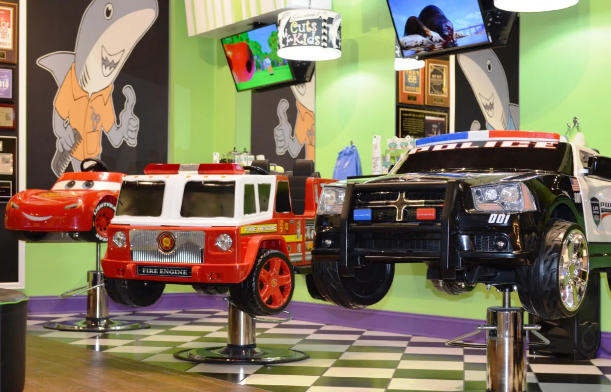 Why sit in a just a regular styling chair? At Sharkey's kids can sit in their choice of a fun car! Including a Fire Truck, Frozen Jeep, Police Car, Lighting McQueen, and more! (cars vary per location)
